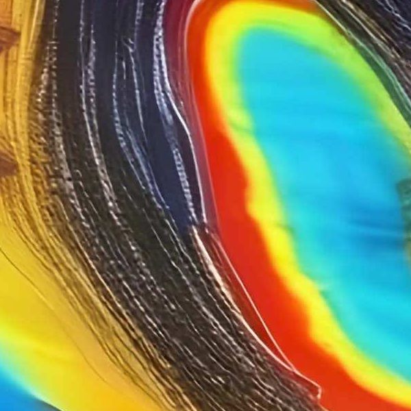 画面は渦のような楕円の輪郭が中心を取り巻き,コバルトからシアン,黄,橙,マゼンタへと連なるスペクトルが滑らかに移り変わります. 光沢のある地肌に細かな筋が走り,液体を撫でた痕跡のようなストロークが流速を示します. 滑らかな虹のグラデーションと,削り取ったような線の荒さが交錯し,光が層の奥で屈折しているかのような奥行きを生みます.