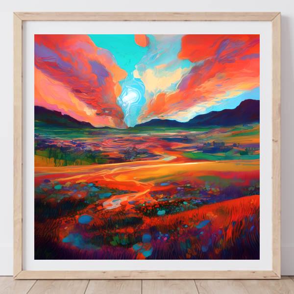 この風景画は,燃えるような朱や深い藍,鮮烈なシアンが空と大地を分かち合うように配置され,中央に向かって伸びる小径が視線を奥へと誘います. 前景の草花や石の繊細な色面と,中景の平原が作る緩やかな遠近感が,色彩のコントラストによって立体的に読み取れます. 全体として光が溶け合うような流動感と詩情を帯びた風景表現が特徴です.