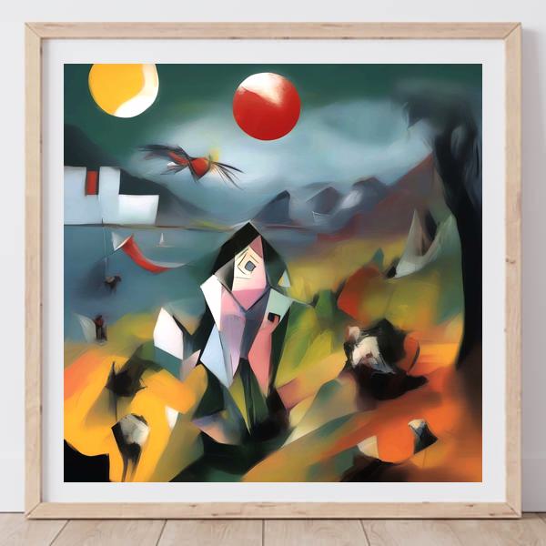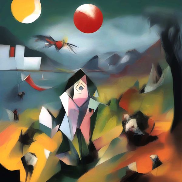 制作者と AI (AI アート作成用のプログラム Stable Diffusion XL 1.0 (1024)) とからなるアートユニット カナブストラクド によるアート画像です.そのプログラムに「Kanabstracd surrealism Chagall」ということば (prompt) をあたえて創造させました. 負のプロンプトとして「Chagall complexity」を指定しています.