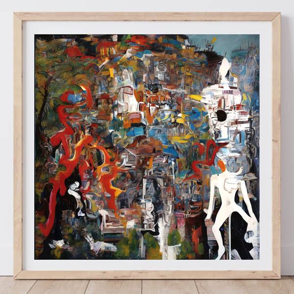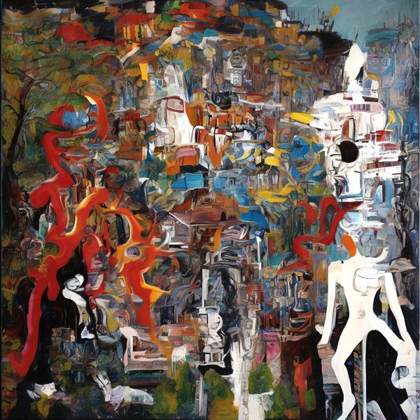 画面いっぱいに色と形が重なり,迷路のように見えます. 青や黄,茶の小さな断片が積み重なり,街並みや崩れた建物の気配が生まれます. 右には白い人型が立ち,空洞の目が周囲を見回すようです. 左には炎やリボンのような赤い線が踊り,全体に強い動きが出ています. 筆あとが厚く,偶然にできたにじみや欠けも表情になっています.