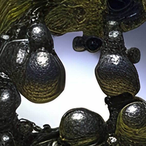 A band of swirling metal sweeps broadly across the picture plane, its surface budding with innumerable swellings like lava bubbles. The sleek, mirror-like skin glows a sulfurous yellow and, locked in a push-and-pull with the dull silver behind it, conveys at once sensations of hardness and flow. Black spheres, large and small, are arranged like satellites adrift on a tide, drawing the gaze into the depths of the vortex and generating spatial depth and motion. The work’s originality lies in its construction of a metaphor for organic growth while preserving the material presence of metal. The torus-like, circulating form suggests the breath of life, while the surface bubbles simultaneously evoke microbial proliferation and cosmic accretion. Intense reflected light turns emptiness into a pictorial element, and the ambiguity of scale, together with a rhythm of self-similarity, produces a distinctive sense of immersion.