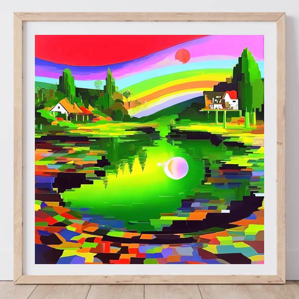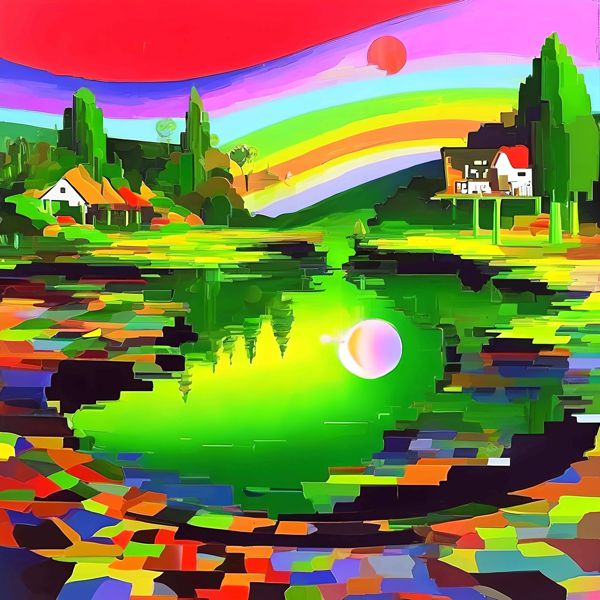 赤とピンクの空に虹が大きく弧を描き,湖の中央には光る球が浮かんでいます. 岸辺や木々,家は四角い色のかけらで組み立てられたように描かれ,緑の水面は蛍光色に輝きます. 反射は細部を省き,輪郭だけが残されているので,風景なのに少しゲームの画面のように見えます. 遠近は浅く,全体が平らな絵模様としてつながって見えます.