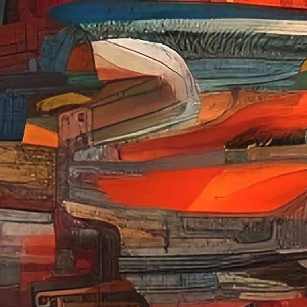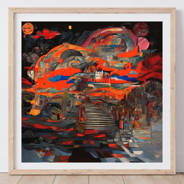 写実的な風景画のように一つの光源や遠近法に従うのではなく,視点が揺れ,時間が折りたたまれたように感じられます. 印象派が光の移ろいを追ったのに対し,この絵は形の断片を積み上げて記憶の街を作ります. キュビスムやシュルレアリスムを思わせますが,強い赤が物語の熱を与え,静かな色面との対比で奥行きが生まれています.