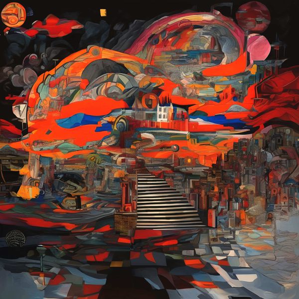 画面全体に黒が広がり,その上を溶岩のような赤と橙の帯が横切り,中央には白と黒の階段が奥へ伸びていきます. 階段の先には小さな建物が浮かび,周囲には機械の部品や街の瓦礫のような断片が幾層にも重なっています. 上空には球体や弧が漂い,空と都市,夢と現実が入り混じった景色がゆっくりと脈打つように見えます.
