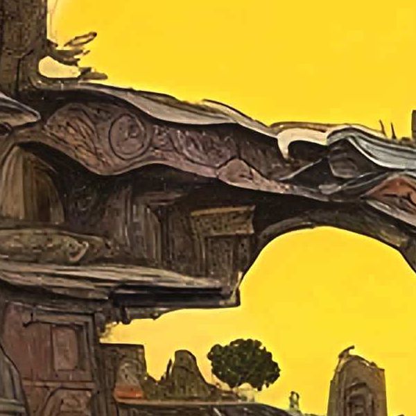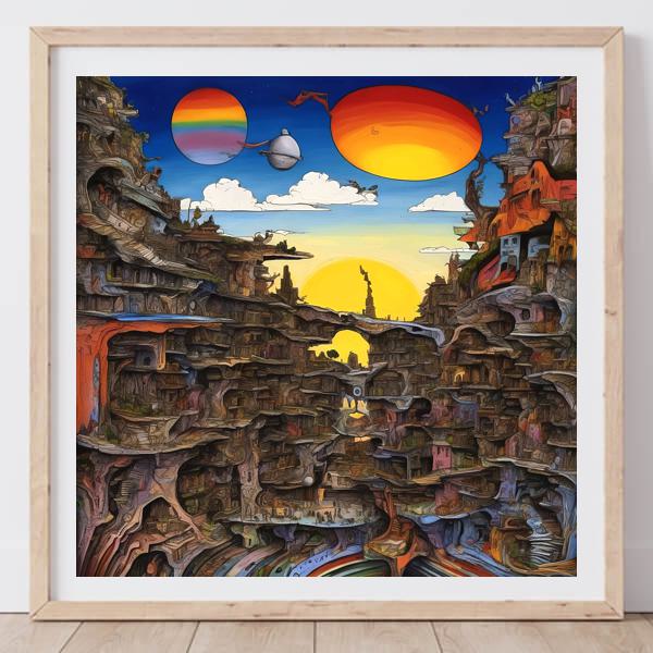 写実的な風景画が一つの光や厳密な遠近で現実感を整えるのに対し,この絵は層を重ねて視点を遊ばせ,見る人を街歩きへ誘います. 金属的で直線的なSF都市とも違い,岩と土の手ざわりが前に出て,手作りの温もりがあります. 絵本の挿絵のような鮮やかさと宇宙的な広がりが合わさり,やさしい冒険心を呼び起こします.
