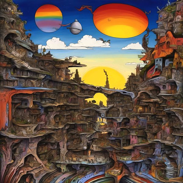 岩山をくり抜いた街が層のように重なり,洞窟の家々や細い橋が迷路のようにつながっています. 中央には朝日の円がのぼり,橙から青へと空のグラデーションが広がります. 頭上には虹色の帯をまとう円や小さな飛行体が浮かび,厚い輪郭線と滑らかな色面が,にぎやかで温かな空気をつくっています.