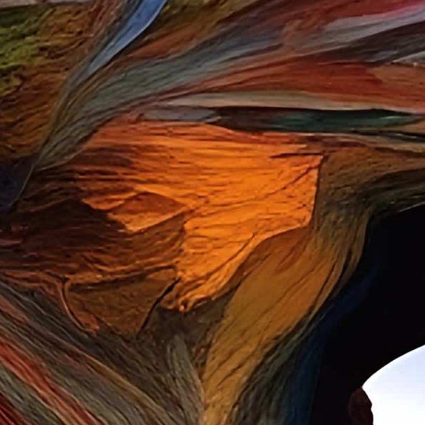 この作品は,樹木と岩盤が一体化したような奇怪で壮麗な造形を,流れるような筆致と鮮烈な色彩で描いた幻想風景です. 層を成すテクスチャーが視線を中心へと誘導し,手前のねじれた幹から遠景の静かな地平線へと視点が移ることで,静謐さと不安が交錯する独特の空気感が生まれています.