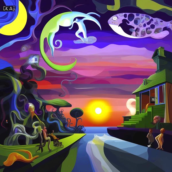 制作者と AI (AI アート作成用のプログラム Stable Diffusion XL 1.0 (1024)) とからなるアートユニット カナブストラクド によるアート画像です.そのプログラムに「Kanabstracd surrealism Chagall」ということば (prompt) をあたえて創造させました. 負のプロンプトとして「Chagall arrows」を指定しています.