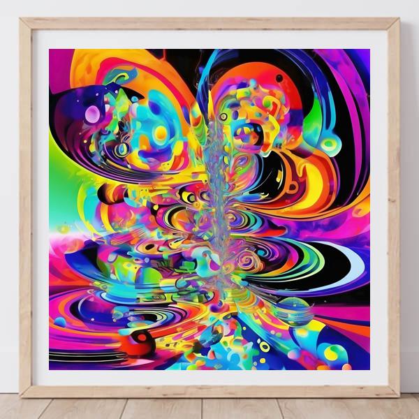 この絵は,強い原色が渦を巻きながら広がる抽象画です. はっきりした輪郭よりも,流れるような線や楕円形が重なり合い,音楽が鳴っているようなリズムを感じさせます. 中央には噴水のような細い柱が立ち上がり,その周りを光る粒や泡のような丸い形が飛び交っていて,水面に映る光を見ているようにも感じられます. はっきりしたモチーフはありませんが,蝶や花,銀河のようにも読み取れるため,見る人の想像力にゆだねた表現になっていると思います.