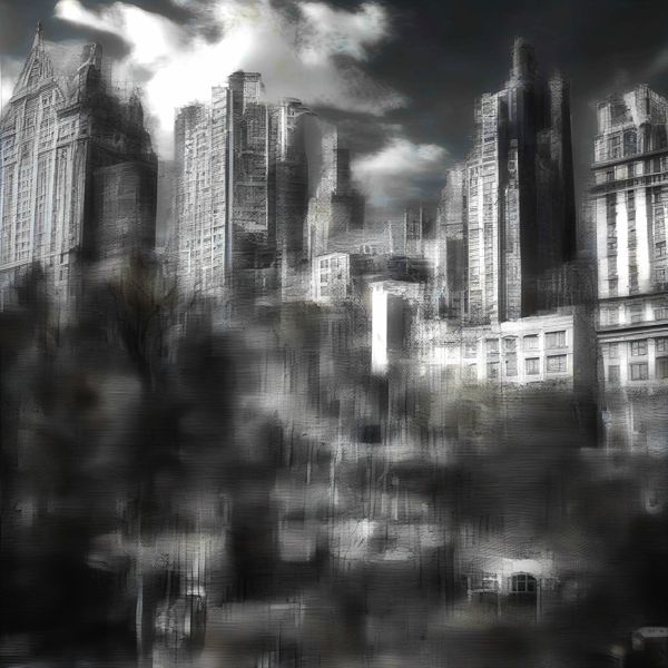 これらの画像は通常の AI アートとはちがう独自の方法を使って作っています. AI アートは AI にプロンプト (または呪文) とよばれる英語の記述をあたえて作画した画像ですが, Stable Diffusion,DALL・E 2,Midjourney などの AI プログラムによって 2022 年に爆発的に普及しました. AI アートで望む画像を作るために通常は比較的細かい指示を与えます. しかしデイシンではおもに 1〜4 語程度の短いことばや造語を Stable Diffusion XL 1.0 (1024) を使用している OpenArt,NightCafe などのウェブサイトで使用して,そのプログラムがもつ知識をいかして自由に (ジェネラティブに,創発的に) 画像をつくらせています. コントラストの調整等はしていますが,描きなおさせたり加筆したりするようなことはしていません.