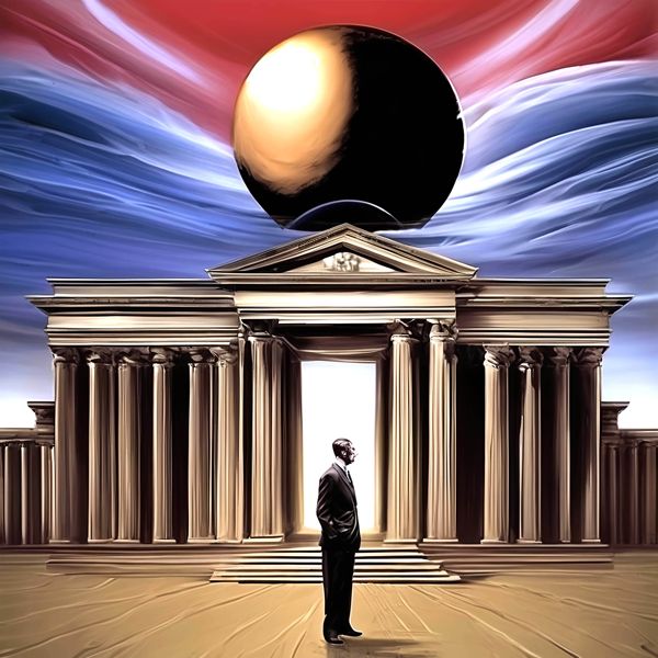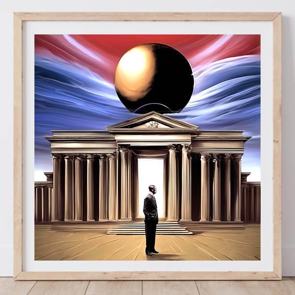 制作者と AI (AI アート作成用のプログラム Stable Diffusion XL 1.0 (1024)) とからなるアートユニット カナブストラクド によるアート画像です.そのプログラムに「Kanabstracd surrealism Chirico」ということば (prompt) をあたえて創造させました. 負のプロンプトとして「Chirico coarse_checker」を指定しています.