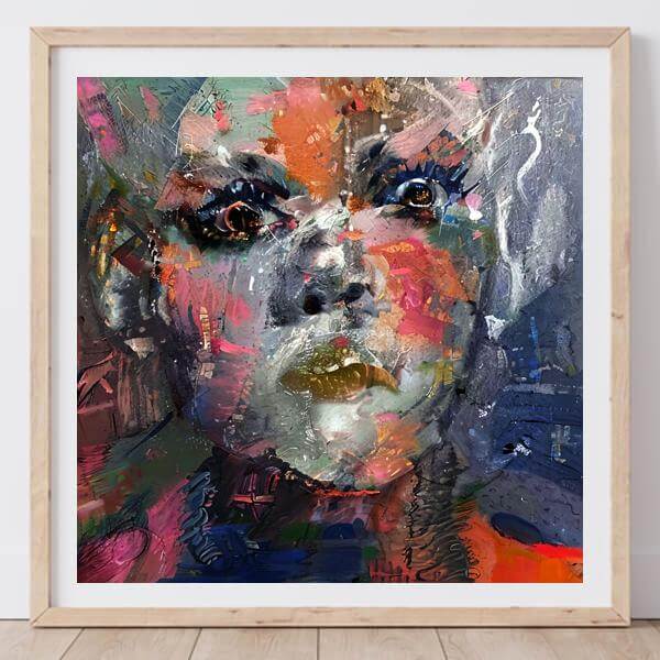 AI アートでは通常 A6 サイズ相当くらい (縦横 500〜1000 ピクセルくらい) の荒い画像しかつくれないので,超解像という技術をつかって原画より解像度を 4〜8 倍に (こまかく) しています. ただし,上の商品画像の解像度は原画と同程度なのでご注意ください.