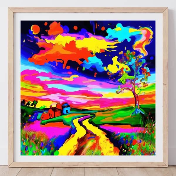 この絵は,鮮やかな色彩と大胆な筆遣いが特徴で,ポスト印象派やフォーヴィスムの影響を受けているように見えます. 特に,ヴィンセント・ヴァン・ゴッホやアンリ・マティスの作品を思わせる色彩の豊かさと動きがあります. 空の鮮やかなオレンジやピンク,青のコントラストは,感情的でダイナミックな雰囲気を醸し出しています. 道が画面の中央を流れるように描かれ,視線を奥へと導きます. 木や家の形状はシンプルでありながら,色彩の選択によって強い存在感を持っています. 全体として,自然の風景を抽象的かつ感情的に表現した作品であり,見る者に強い印象を与えます.