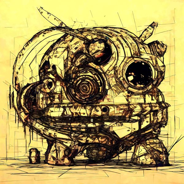 これらの画像は通常の AI アートとはちがう独自の方法を使って作っています. AI アートは AI にプロンプト (または呪文) とよばれる英語の記述をあたえて作画した画像ですが, Stable Diffusion,DALL・E 2,Midjourney などの AI プログラムによって 2022 年に爆発的に普及しました. AI アートで望む画像を作るために通常は比較的細かい指示を与えます. しかしデイシンではおもに 1〜4 語程度の短いことばや造語を Stable Diffusion XL 1.0 (1024) を使用している OpenArt,NightCafe などのウェブサイトで使用して,そのプログラムがもつ知識をいかして自由に (ジェネラティブに,創発的に) 画像をつくらせています. コントラストの調整等はしていますが,描きなおさせたり加筆したりするようなことはしていません.