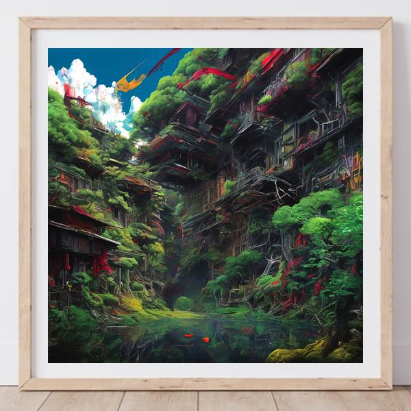 In AI art, the images generated are usually quite rough—about the size of an A6 print (roughly 500–1000 pixels on each side). To make them suitable for presentation, I use a technique called super-resolution, which increases the resolution 4–8 times higher than the original, adding finer detail. However, please note that the resolution of the product image shown above is about the same as the original and has not been upscaled.