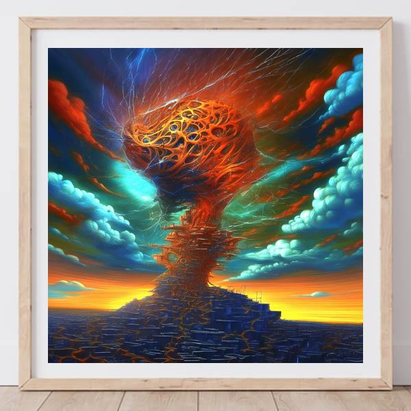 制作者と AI (AI アート作成用のプログラム Stable Diffusion XL 1.0 (1024)) とからなるアートユニット カナブストラクド によるアート画像です.そのプログラムに「Kanabstracd surrealism intricate_thunder」ということば (prompt) をあたえて創造させました. 負のプロンプトとして「intricate_thunder」を指定しています.