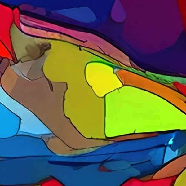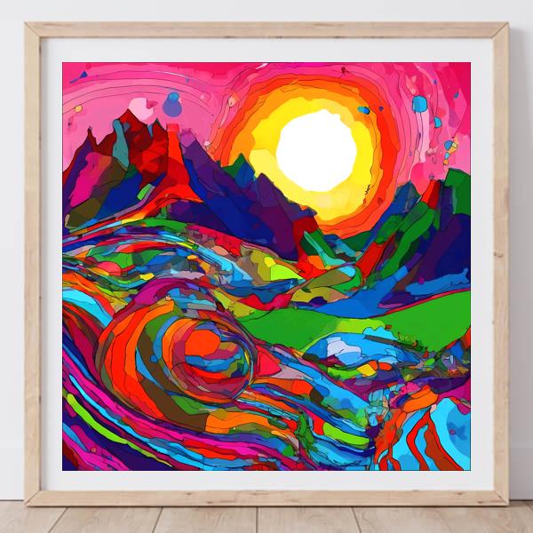 この作品は,強烈な彩度の色面と輪郭線が重なり合い,太陽を中心に山並みと渦巻く地形がリズミカルに展開する抽象的な風景画です. 暖色と寒色が鮮やかに対比し,断片化された色塊がステンドグラスのように配されることで深さと動きを生み,観る者を視覚的に引き込む躍動感を与えます.