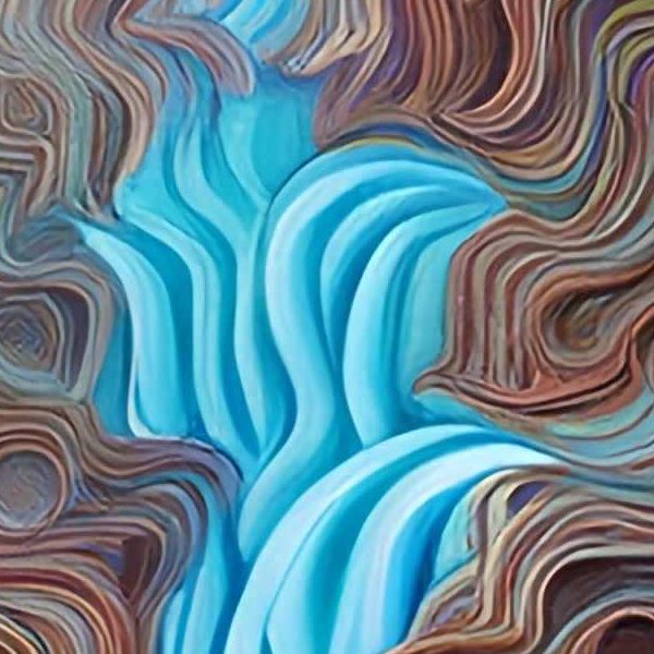 中央に白い太陽が輝き,その下を青い滝が谷底へ流れ落ちています. 地形はすべて波打つ線でできており,等高線の地図のように層が重なって見えます. 茶や赤の曲線が岩肌をつくり,澄んだ水だけが寒色で強く対比されます. 空には虹色の輪が幾重にも広がり,左には縞模様の球体が浮かんでいます. 写実というより,色と線のリズムで自然の動きを表した,幻想的な風景画です.