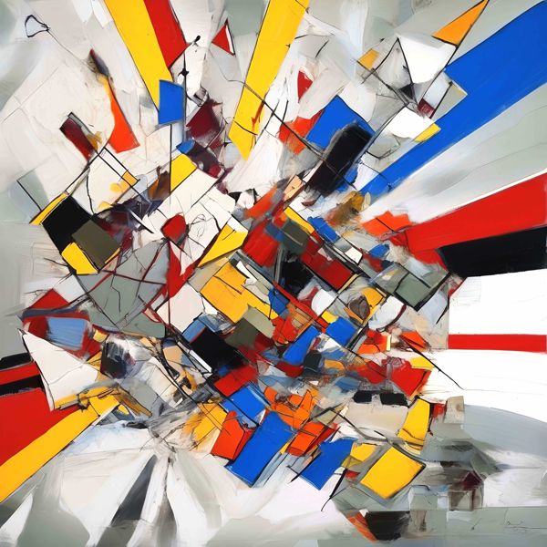 制作者と AI (AI アート作成用のプログラム Stable Diffusion XL 1.0 (1024)) とからなるアートユニット カナブストラクド によるアート画像です.そのプログラムに「Kanabstracd absurd_realism Mondrian」ということば (prompt) をあたえて創造させました. 負のプロンプトとして「Mondrian mesh」を指定しています.