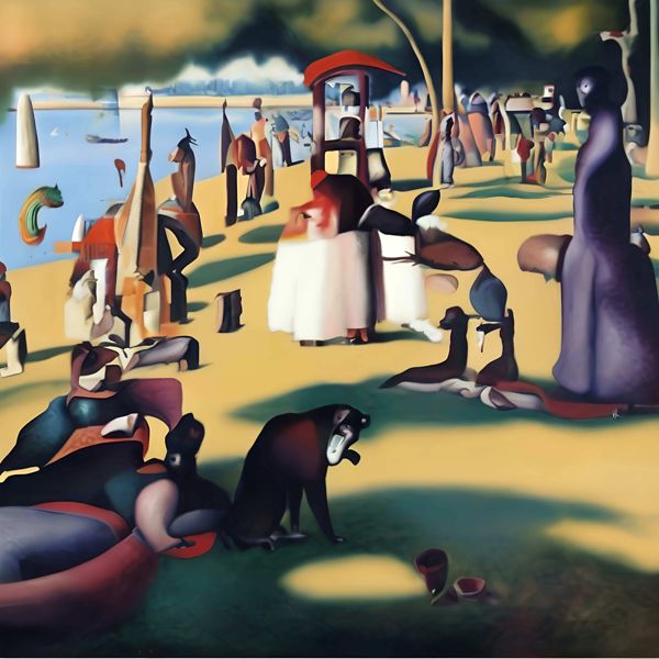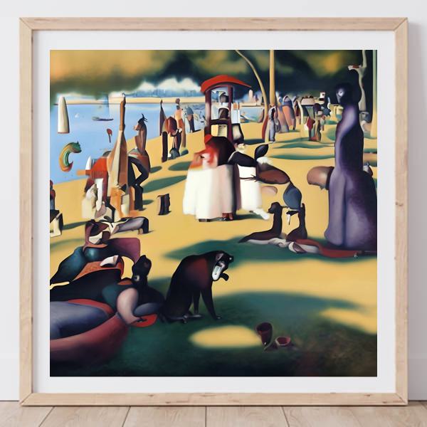 制作者と AI (AI アート作成用のプログラム Stable Diffusion XL 1.0 (1024)) とからなるアートユニット カナブストラクド によるアート画像です.そのプログラムに「Kanabstracd absurd_realism Seurat」ということば (prompt) をあたえて創造させました. 負のプロンプトとして「Seurat woodgrain」を指定しています.