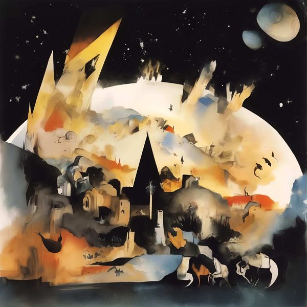 制作者と AI (AI アート作成用のプログラム Stable Diffusion XL 1.0 (1024)) とからなるアートユニット カナブストラクド によるアート画像です.そのプログラムに「Kanabstracd Kandinsky Hieronymus_Bosch」ということば (prompt) をあたえて創造させました. 負のプロンプトとして「Kandinsky Hieronymus_Bosch mesh」を指定しています.