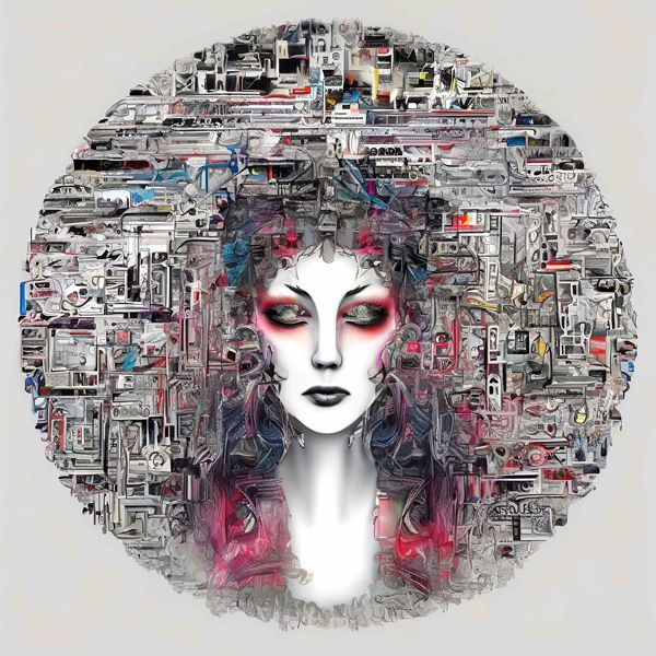 これらの画像は通常の AI アートとはちがう独自の方法を使って作っています. AI アートは AI にプロンプト (または呪文) とよばれる英語の記述をあたえて作画した画像ですが, Stable Diffusion,DALL・E 2,Midjourney などの AI プログラムによって 2022 年に爆発的に普及しました. AI アートで望む画像を作るために通常は比較的細かい指示を与えます. しかしデイシンではおもに 1〜4 語程度の短いことばや造語を Stable Diffusion XL 1.0 (1024) を使用している OpenArt,NightCafe などのウェブサイトで使用して,そのプログラムがもつ知識をいかして自由に (ジェネラティブに,創発的に) 画像をつくらせています. コントラストの調整等はしていますが,描きなおさせたり加筆したりするようなことはしていません.