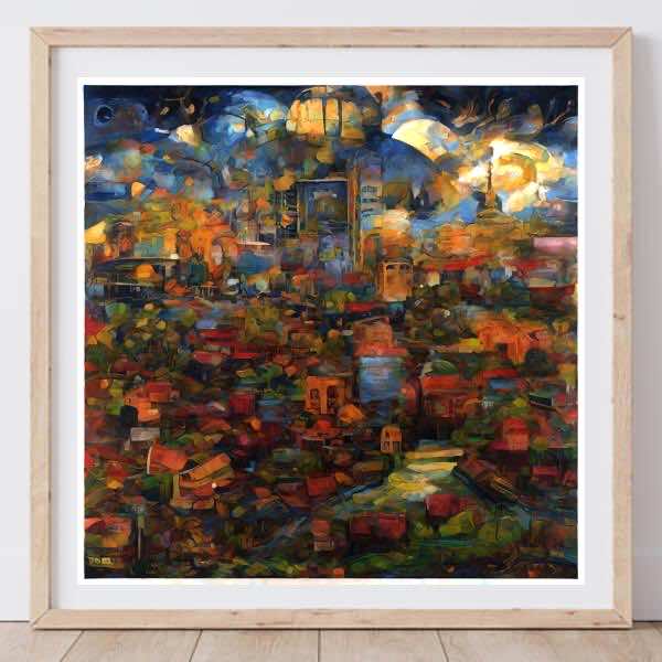 AI アートでは通常 A6 サイズ相当くらい (縦横 500〜1000 ピクセルくらい) の荒い画像しかつくれないので,超解像という技術をつかって原画より解像度を 4〜8 倍に (こまかく) しています. ただし,上の商品画像の解像度は原画と同程度なのでご注意ください.