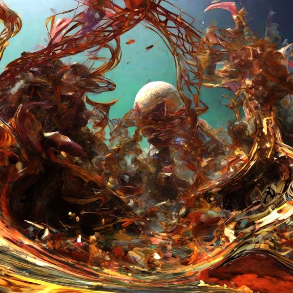 これらの画像は通常の AI アートとはちがう独自の方法を使って作っています. AI アートは AI にプロンプト (または呪文) とよばれる英語の記述をあたえて作画した画像ですが, Stable Diffusion,DALL・E 2,Midjourney などの AI プログラムによって 2022 年に爆発的に普及しました. AI アートで望む画像を作るために通常は比較的細かい指示を与えます. しかしデイシンではおもに 1〜4 語程度の短いことばや造語を Stable Diffusion XL 1.0 (1024) を使用している OpenArt,NightCafe などのウェブサイトで使用して,そのプログラムがもつ知識をいかして自由に (ジェネラティブに,創発的に) 画像をつくらせています. コントラストの調整等はしていますが,描きなおさせたり加筆したりするようなことはしていません.