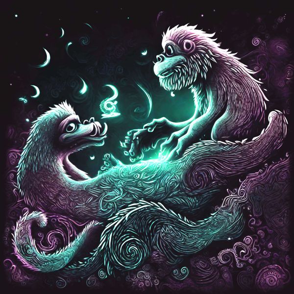 これらの画像は通常の AI アートとはちがう独自の方法を使って作っています. AI アートは AI にプロンプト (または呪文) とよばれる英語の記述をあたえて作画した画像ですが, Stable Diffusion,DALL・E 2,Midjourney などの AI プログラムによって 2022 年に爆発的に普及しました. AI アートで望む画像を作るために通常は比較的細かい指示を与えます. しかしデイシンではおもに 1〜4 語程度の短いことばや造語を Stable Diffusion XL 1.0 (1024) を使用している OpenArt,NightCafe などのウェブサイトで使用して,そのプログラムがもつ知識をいかして自由に (ジェネラティブに,創発的に) 画像をつくらせています. コントラストの調整等はしていますが,描きなおさせたり加筆したりするようなことはしていません.