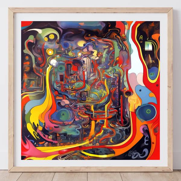 画面いっぱいに赤や黄の帯がうねり,青や緑の塊が浮かびます. 線は絡み合って迷路のようになり,中心へ視線を引き込みます. 層が重なって機械の回路や都市の配管にも見えますが,ところどころに柔らかな光が差し,生き物の体内のようにも感じられます. 右端の細い空間は扉のように明るく,混沌のなかの出口を示しているようです.