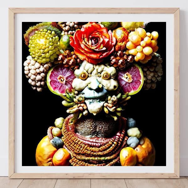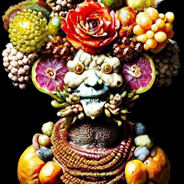 制作者と AI (AI アート作成用のプログラム Stable Diffusion 2.1 (768)) とからなるアートユニット anonymous による画家風のアート画像です.そのプログラムに「arcimboldo」ということば (prompt) をあたえて創造させました. 負のプロンプトとして「severini」を指定しています.
