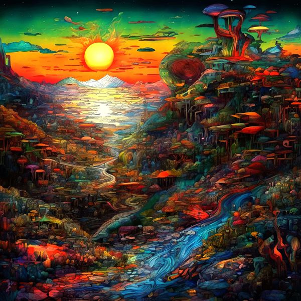 これらの画像は通常の AI アートとはちがう独自の方法を使って作っています. AI アートは AI にプロンプト (または呪文) とよばれる英語の記述をあたえて作画した画像ですが, Stable Diffusion,DALL・E 2,Midjourney などの AI プログラムによって 2022 年に爆発的に普及しました. AI アートで望む画像を作るために通常は比較的細かい指示を与えます. しかしデイシンではおもに 1〜4 語程度の短いことばや造語を Stable Diffusion XL 1.0 (1024) を使用している OpenArt,NightCafe などのウェブサイトで使用して,そのプログラムがもつ知識をいかして自由に (ジェネラティブに,創発的に) 画像をつくらせています. コントラストの調整等はしていますが,描きなおさせたり加筆したりするようなことはしていません.