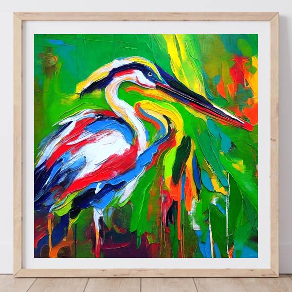 この絵は,鮮やかな色彩と大胆な筆致が特徴的で,印象派やポスト印象派の影響を受けているように見えます. 特に,アンリ・マティスやアンドレ・ドランのようなフォーヴィスムの画家たちの影響が感じられます. 彼らは色彩の大胆な使用と感情の表現を重視していました. この作品では,鳥が中心に描かれ,背景の緑と対比するように赤や青,黄色が使われています. 色の重なりや筆の動きが,動的で生き生きとした印象を与えています. 全体として,自然の美しさと生命力を強調する作品です.
