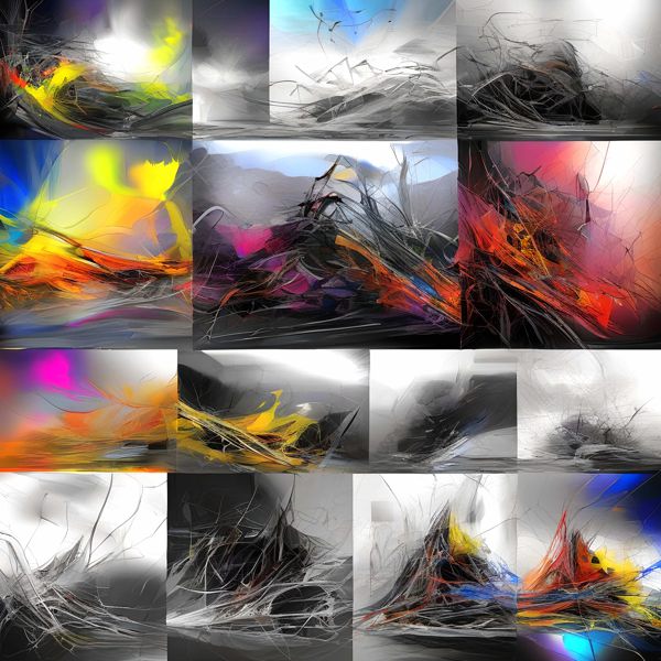 これらの画像は通常の AI アートとはちがう独自の方法を使って作っています. AI アートは AI にプロンプト (または呪文) とよばれる英語の記述をあたえて作画した画像ですが, Stable Diffusion,DALL・E 2,Midjourney などの AI プログラムによって 2022 年に爆発的に普及しました. AI アートで望む画像を作るために通常は比較的細かい指示を与えます. しかしデイシンではおもに 1〜4 語程度の短いことばや造語を Stable Diffusion XL 1.0 (1024) を使用している OpenArt,NightCafe などのウェブサイトで使用して,そのプログラムがもつ知識をいかして自由に (ジェネラティブに,創発的に) 画像をつくらせています. コントラストの調整等はしていますが,描きなおさせたり加筆したりするようなことはしていません.