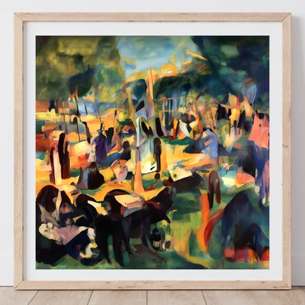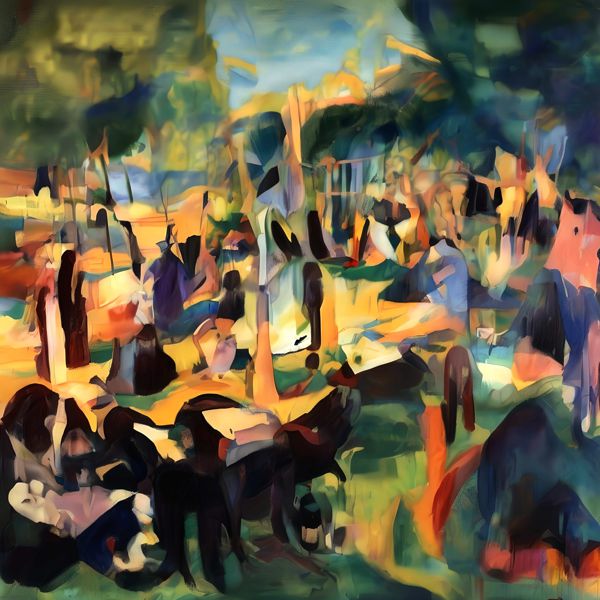 This image was created by ‘Kanabstracd,’ an art unit formed by the creator and the AI (Stable Diffusion XL 1.0 (1024), a program for creating AI artworks). I gave the program the word ‘Kanabstracd absurdism Seurat’ as a prompt and let it create.