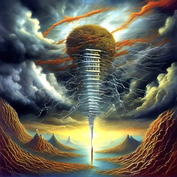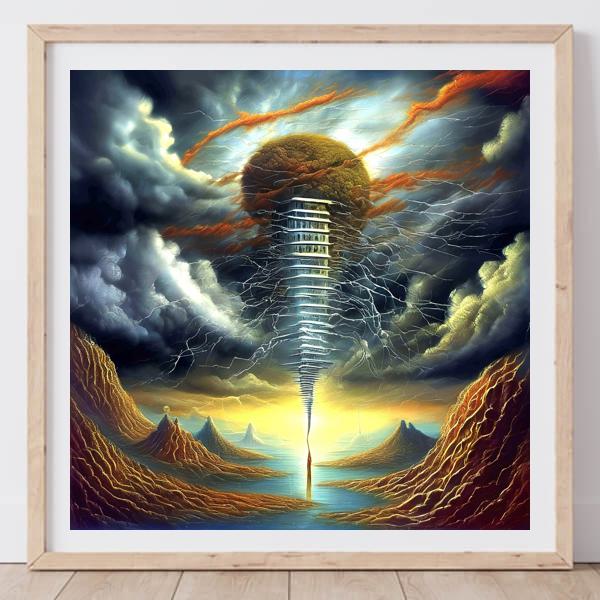 制作者と AI (AI アート作成用のプログラム Stable Diffusion XL 1.0 (1024)) とからなるアートユニット カナブストラクド によるアート画像です.そのプログラムに「Kanabstracd surrealism intricate_thunder」ということば (prompt) をあたえて創造させました. 負のプロンプトとして「intricate_thunder」を指定しています.
