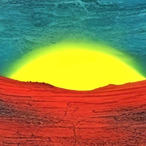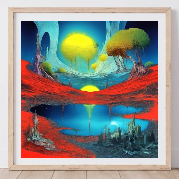鮮烈な赤と深い青が上下に分かれ,中央に二つの太陽が並ぶこの作品は,鏡像のように反転した地表と空を同時に見せることで非現実的な奥行きを生み出しています. 質感は絵画的な筆致とデジタル的な滑らかさが混ざり,樹木の枝や洞窟のアーチ,垂れ下がる鍾乳的な尖塔が幻想的なスケール感を強調します. 赤い大地の亀裂や下層に覗く廃墟のシルエットが,時間の歪みと物語性を暗示しています.