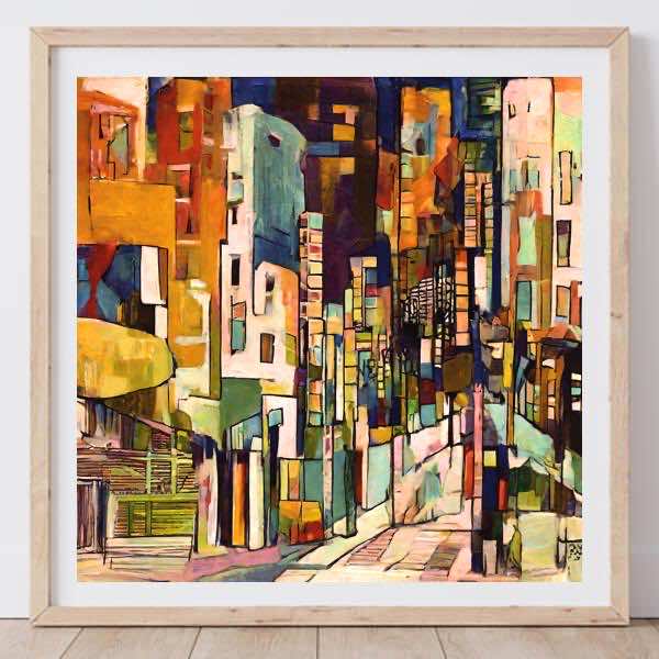 AI アートでは通常 A6 サイズ相当くらい (縦横 500〜1000 ピクセルくらい) の荒い画像しかつくれないので,超解像という技術をつかって原画より解像度を 4〜8 倍に (こまかく) しています. ただし,上の商品画像の解像度は原画と同程度なのでご注意ください.