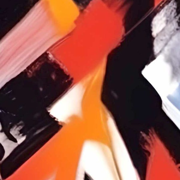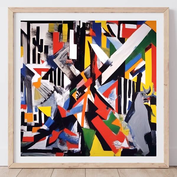 この絵は,抽象表現主義とキュビズムの影響を受けた作品のように見えます. 色彩の大胆な使用と幾何学的な形状が特徴的で,ポロックやカンディンスキーの作品を思わせます. 色のコントラストが強く,視覚的なインパクトを与えています. 黒と白のストライプがリズムを生み出し,動的なエネルギーを感じさせます. 形状が重なり合い,視覚的な深みを作り出しており,観る者に多様な解釈を促します. 全体として,混沌とした中にも調和が感じられる作品です.