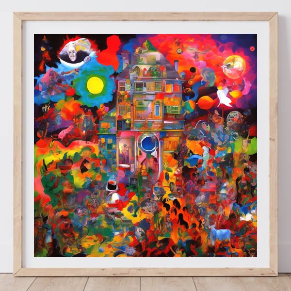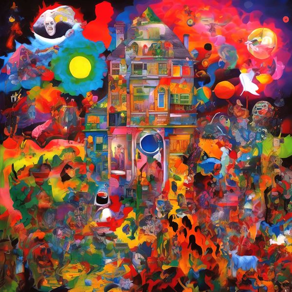この絵は,非常にカラフルで幻想的な要素が詰まった作品です. 中心にある家は,シュルレアリスムの影響を受けているように見えます. シュルレアリスムは,夢や無意識の世界を表現することを目的としており,ダリやマグリットの作品を思わせます.