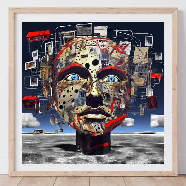 背景に浮かぶ家や写真の断片は,現実と夢の境界を曖昧にするシュルレアリスムの特徴を強調しています. 顔の周囲に配置されたこれらの要素は,記憶や思考の断片を表現しているように見えます.