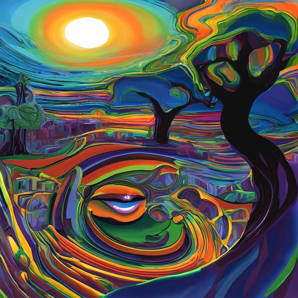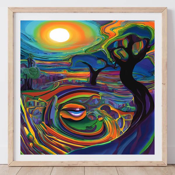 本作は鮮烈な色彩と流動的な筆致が融合した幻想風景画で,中央に輝く太陽が天地を染め上げ,波打つようなラインが顔のようなモチーフや街並みを繋いでいます. 曲線は空間を螺旋状に引き込み,近景の黒い樹形と遠景の明るい輪郭が強い対比を生み,平面と奥行きが同時に共存する視覚的な緊張感を与えます. 色面は油彩の厚みとグラデーションを模したデジタル描写で,微細な輝度差が画面に動きを生んでいます. 鑑賞者は一見抽象的な模様の中に物語や表情を読み取る楽しみが得られます.
