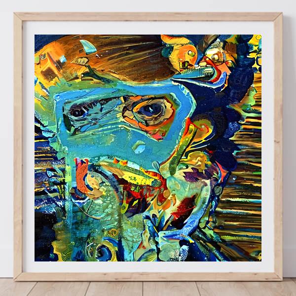 AI アートでは通常 A6 サイズ相当くらい (縦横 500〜1000 ピクセルくらい) の荒い画像しかつくれないので,超解像という技術をつかって原画より解像度を 4〜8 倍に (こまかく) しています. ただし,上の商品画像の解像度は原画と同程度なのでご注意ください.