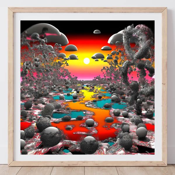 この作品は,夕陽が水平線に沈む瞬間を思わせる強烈なグラデーションを背景に,鏡面の球体と有機的なフラクタル状の塊が混在する独特の景観を描いています. 中央を貫く水路は赤から黄,青へと溶け合い,異質な色彩と立体感が同時に共存することで現実と夢の境界が曖昧になります. CG特有の光沢とテクスチャが視覚的な緊張感を生み出し,観る者の想像力を刺激します.