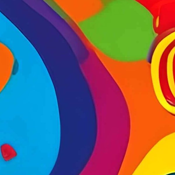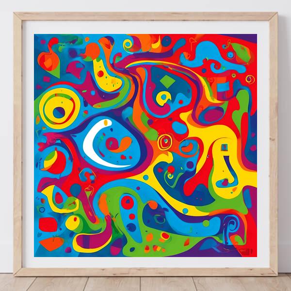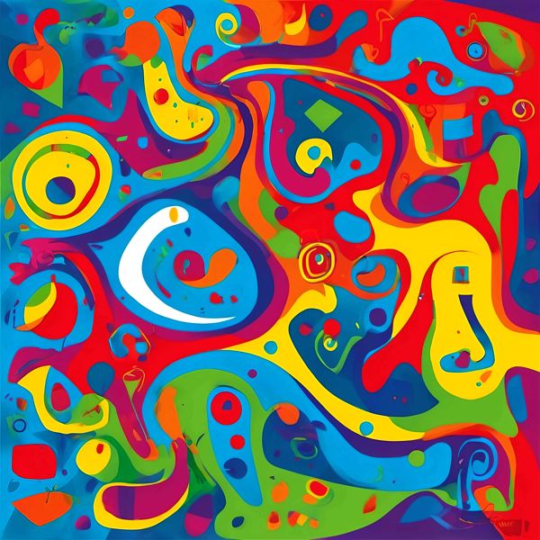 この作品は鮮烈な原色と曲線的な有機形態が躍動する抽象画です. 赤・青・黄を基調に緑や紫が層を成し,大小の円やしずく状のモチーフがリズムを刻むことで視線が画面内を巡ります. 全体に音楽的な高揚感と遊び心が漂い,観る者を即座に惹きつけます.