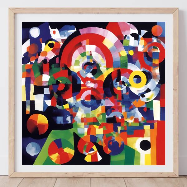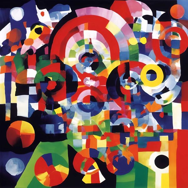 この絵は,ロバート・デローネの影響を受けたオルフィスムのスタイルを思わせます. オルフィスムは,色彩と形状を用いて音楽的なリズムや動きを表現することを目指した芸術運動です. この作品では,鮮やかな色彩と円形のモチーフが多用され,視覚的なダイナミズムを生み出しています. 色の重なりや透明感が,深みと複雑さを加えています. 幾何学的な形状が組み合わさり,視覚的なハーモニーを作り出しており,観る者にエネルギーと調和を感じさせます. 全体として,抽象的な表現を通じて,視覚的な音楽を奏でているかのような印象を与えます.