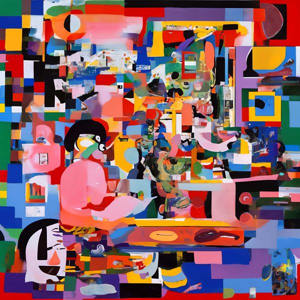 制作者と AI (AI アート作成用のプログラム Stable Diffusion XL 1.0 (1024)) とからなるアートユニット カナブストラクド によるアート画像です.そのプログラムに「Kanabstracd absurdism Picasso」ということば (prompt) をあたえて創造させました. 負のプロンプトとして「Picasso bows」を指定しています.