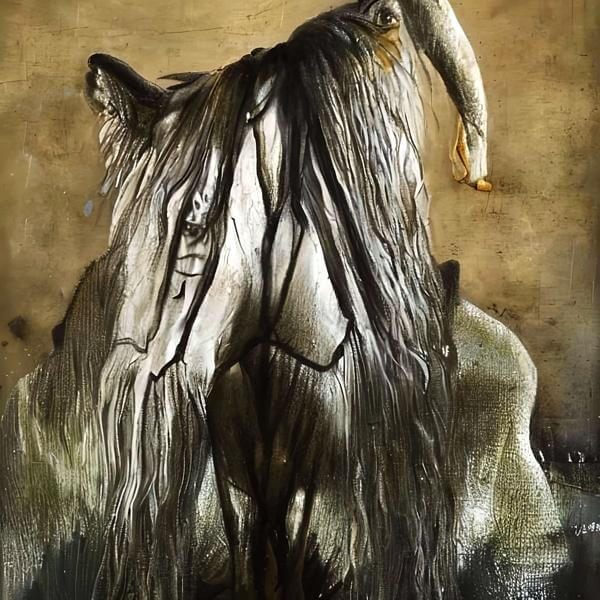 これらの画像は通常の AI アートとはちがう独自の方法を使って作っています. AI アートは AI にプロンプト (または呪文) とよばれる英語の記述をあたえて作画した画像ですが, Stable Diffusion,DALL・E 2,Midjourney などの AI プログラムによって 2022 年に爆発的に普及しました. AI アートで望む画像を作るために通常は比較的細かい指示を与えます. しかしデイシンではおもに 1〜4 語程度の短いことばや造語を Stable Diffusion 2.1 (768) を使用している OpenArt,NightCafe などのウェブサイトで使用して,そのプログラムがもつ知識をいかして自由に (ジェネラティブに,創発的に) 画像をつくらせています. コントラストの調整等はしていますが,描きなおさせたり加筆したりするようなことはしていません.