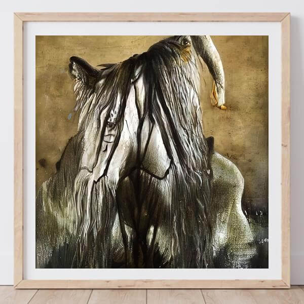 AI アートでは通常 A6 サイズ相当くらい (縦横 500〜1000 ピクセルくらい) の荒い画像しかつくれないので,超解像という技術をつかって原画より解像度を 4〜8 倍に (こまかく) しています. ただし,上の商品画像の解像度は原画と同程度なのでご注意ください.