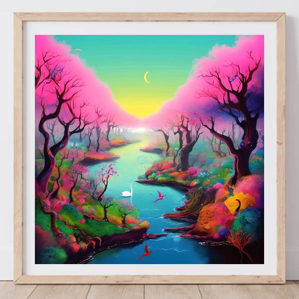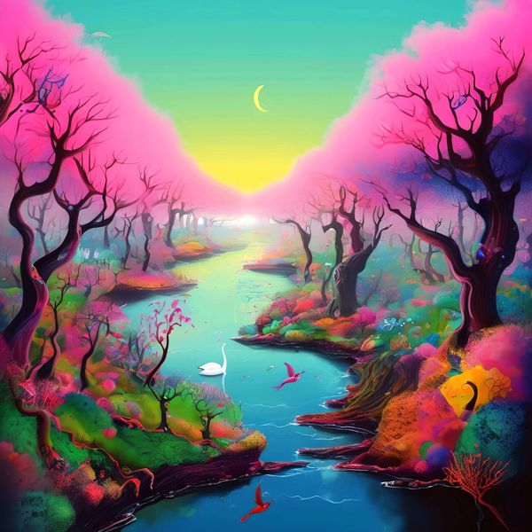 この絵は中央を縦に貫く穏やかな川を軸に,左右に広がる桃色の樹々と多彩な草地が夢のような風景を作り上げています. 空は黄緑から深い青への滑らかなグラデーションで満たされ,淡い三日月が静かに浮かぶ中,白鳥や小鳥が点景として配されて詩的で穏やかな時間が流れているように感じられます. 色の饒舌さと柔らかな光の表現が,非現実的で温かな情感を強めています.